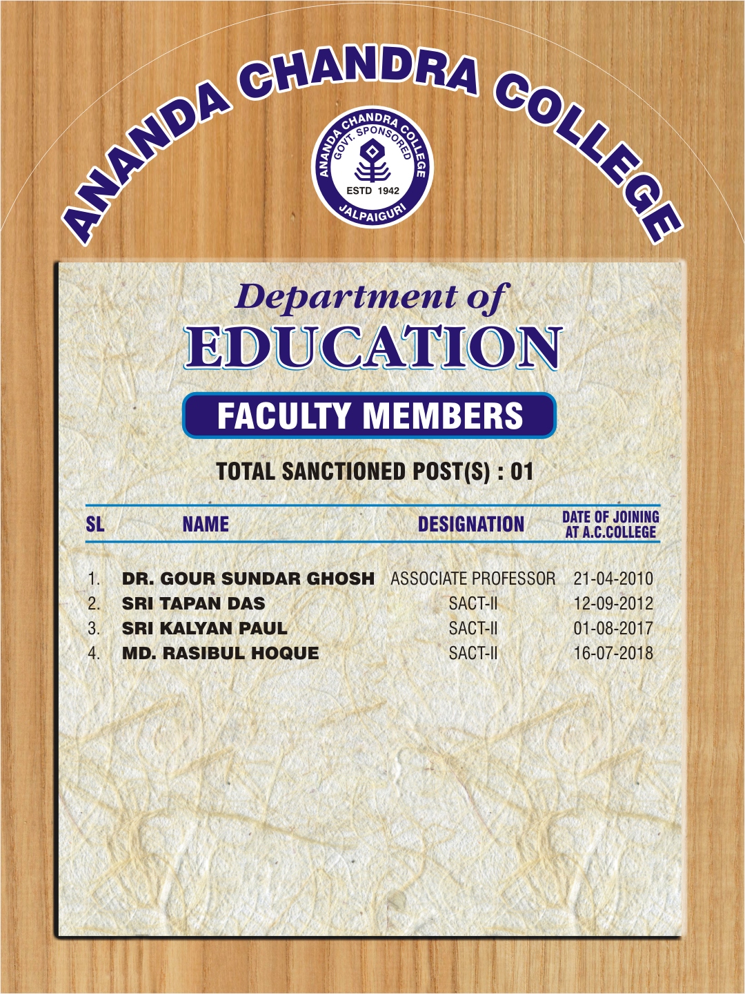 faculty includes one teacher in substantive post and three SACT teachers. Over