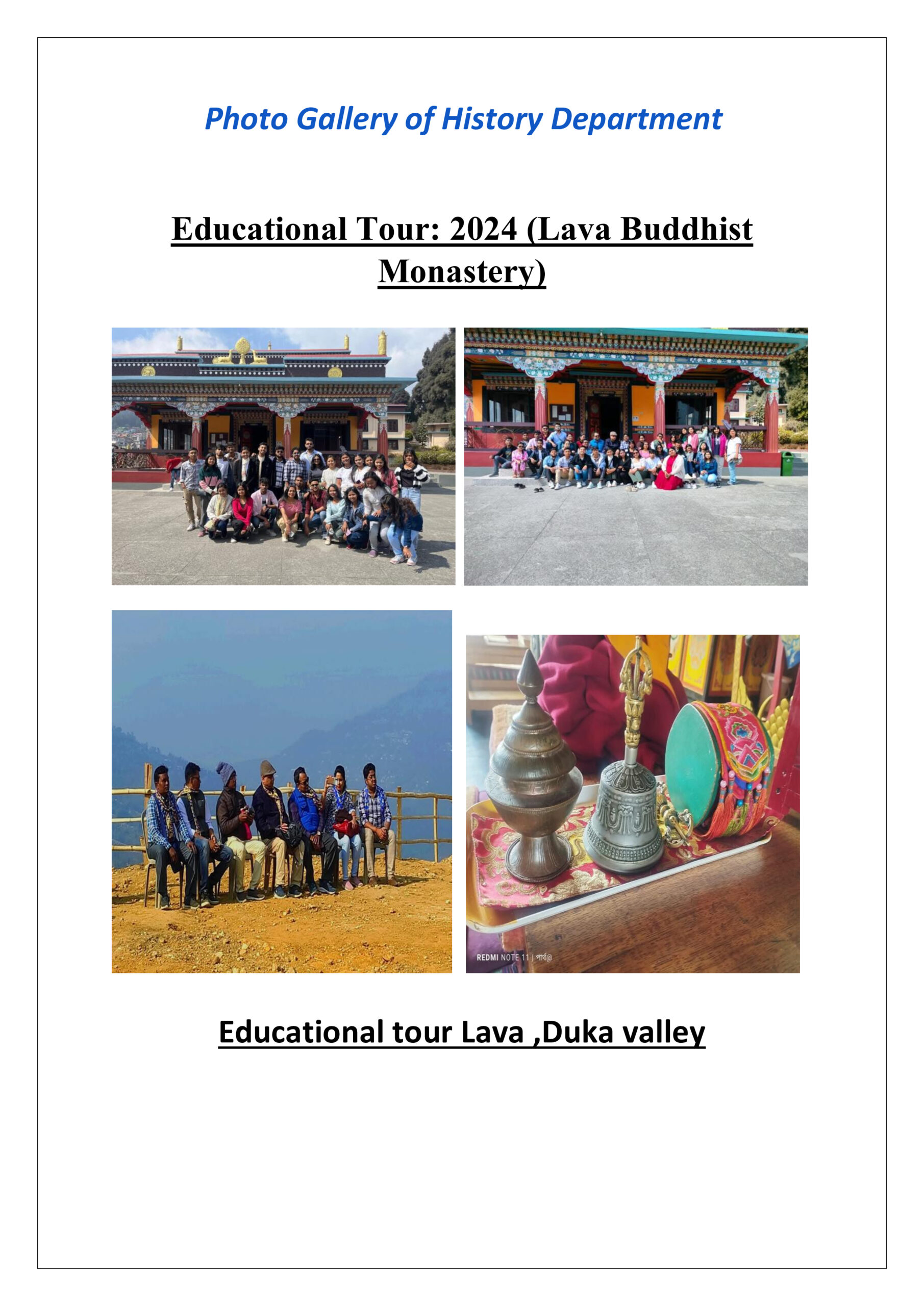 The Department of History successfully arranged educational tour programme just like previous years. In this academic session(2023-2024), the destination of the educational tour was Lava Monastery in which a number of Old Tibetan Manuscripts are preserved. Moreover the site is the symbol of excellent blend of old Buddhist Tibetan Culture with modern Tibeto-Bbuddhist outlook . A team of students of 2nd and 4th semester was accompanied by 7 teachers for this educational trip as a part of the curriculum of the both semesters.