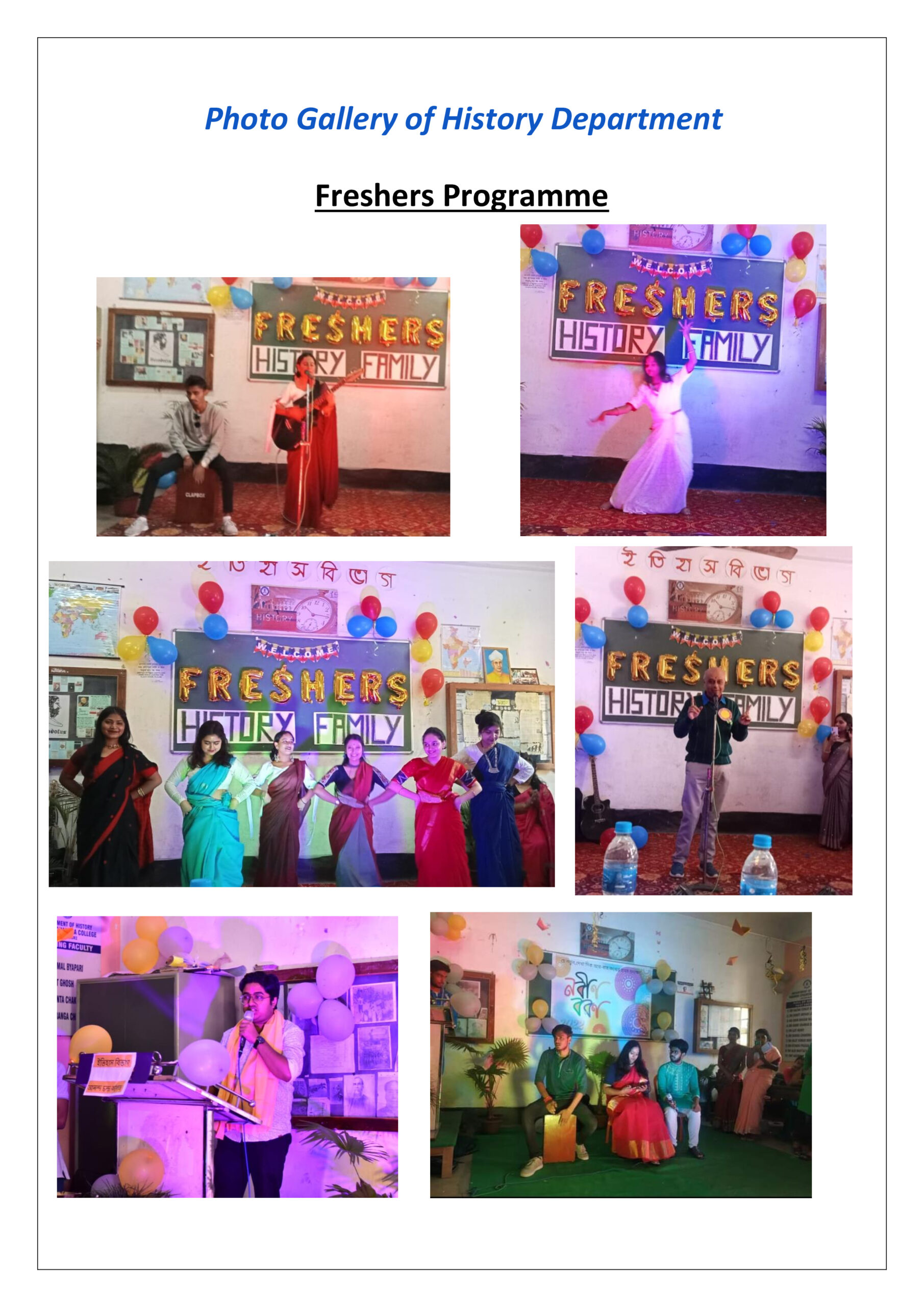 Apart from day to day teaching - learning, the Department organizes Educational Tour Programme for the betterment of the students. In addition to it, a number of Cultural Programmes are organized in the Department to nurture the skill of the pupils in cultural arena. The Department of History in a body, serves the society as a hub of organized education in the apparently under developed northern part of West Bengal.