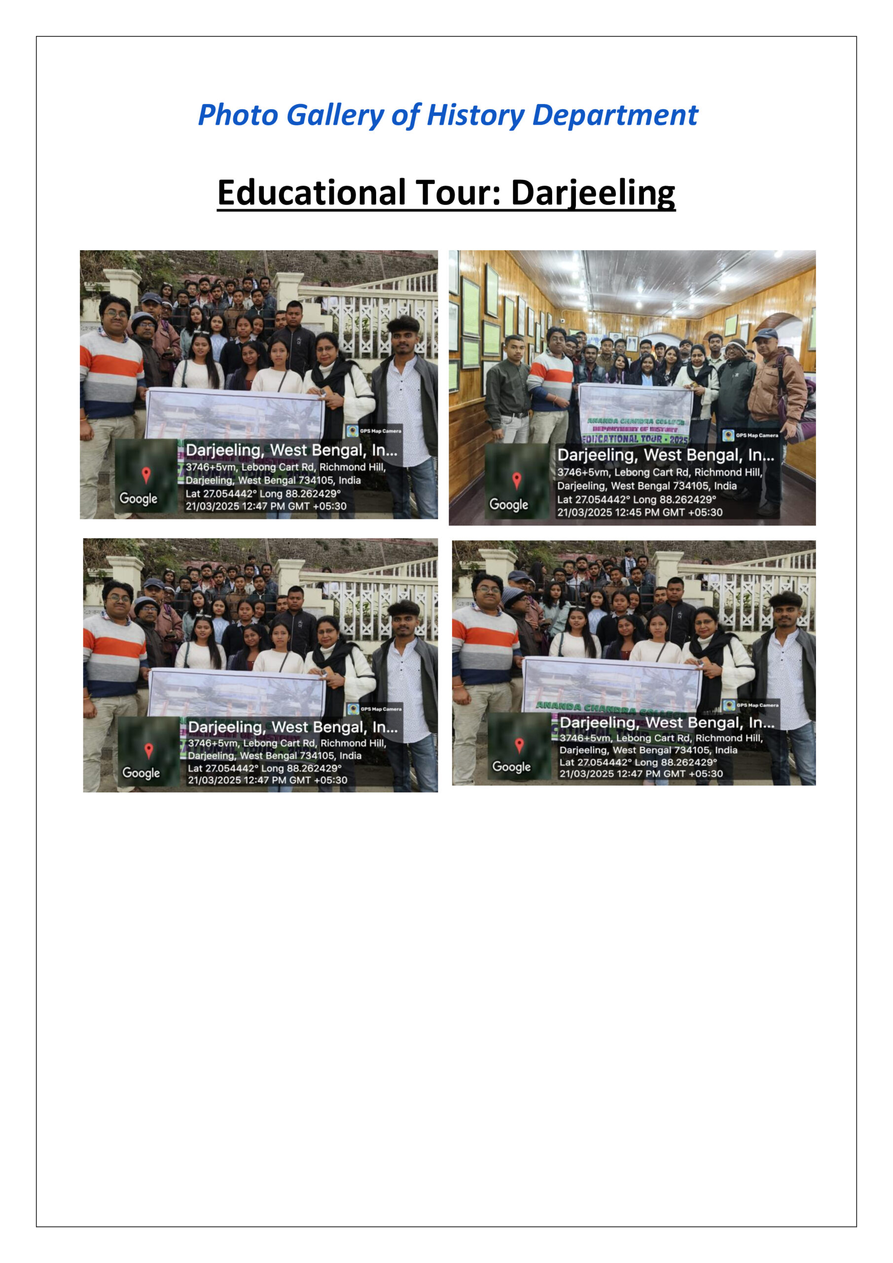 The Educational Tour Programme of the Department of History of Ananda Chandra College has been arranged in 2022-2023 academic session like previous academic year. The destination of this Tour Programme is Rabindra Museum, Mongpoo, district Darjeeling. The museum house was a bungalow where famous poet Rabindranath Tagore stayed in 1938 as a guest of eminent quintologist Dr. Manmohan Sen and his wife Maitreyi Debi, the creator of “Na Hanyate” novel. This bungalow had been transformed into museum with various photographs, paintings, and a few original writings of Tagore together with some writing items used by Tagore.