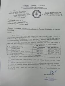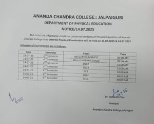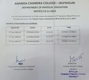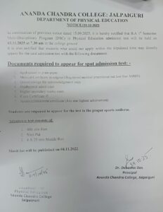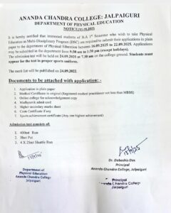 The Physical Education Department Established in 1999, the department offers B.A. (Program / Multidisciplinary) courses in arts. The Physical Education Department of Ananda Chandra College , Jalpaiguri, plays a vital role in promoting Physical Fitness ,Wellness and Holistic development among students. The Department organizes various sports activities ,inter college competitions, and training programs, fostering a sprit of team work and discipline,with experienced faculty and adequate infrastructure ,it encourage active participation in both indoor games ,contributing to the all round development of students.